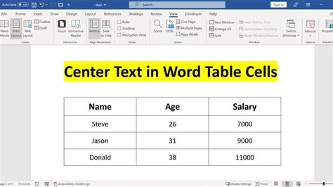 how to center text in chart word