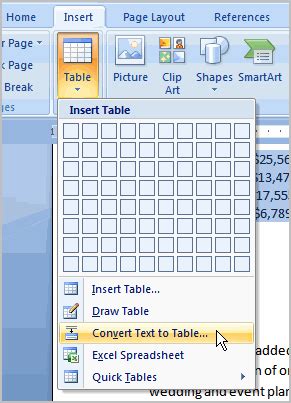 how to convert text to table in word 2007