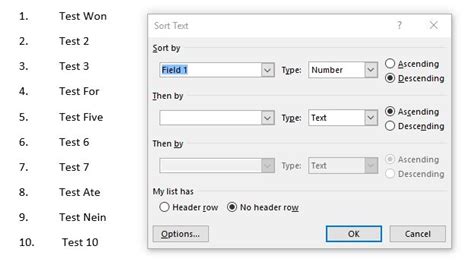 how to make a descending number list in word