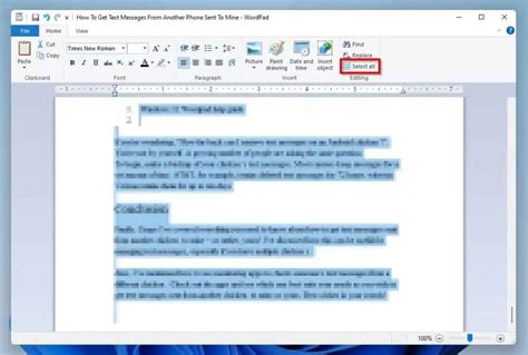 which shortcut key is used to select all text in wordpad